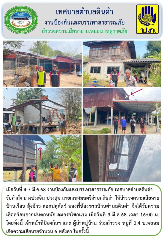 \r\nรับคำสั่ง นางประจิน ปวงสุข นายกเทศมนตรีตำบลดินดำ ให้สำรวจความเสียหายบ้านเรือน ยุ้งข้าว คอกปศุสัตว์ ของพี่น้องชาวบ้านตำบลดินดำ ซึ่งได้รับความเดือดร้อนจากฝนตกหนัก ลมกรรโชกแรง เมื่อวันที่ 3 มี.ค.68 เวลา 16:00 น. โดยทั้งนี้ เจ้าหน้าที่ป้องกันฯ และ ผู้นำหมู่บ้าน ร่วมสำรวจ หมู่ที่ 3,4 บ.พยอม เกิดความเสียหายจำนวน 6 หลังคา ในครั้งนี้