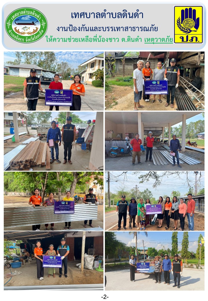 เมื่อวันที่ 11-13 มี.ค.68 งานป้องกันและบรรเทาสาธารณภัย เทศบาลตำบลดินดำ นำวัสดุ-อุปกรณ์ ซ่อมแซมความเสียหายบ้านเรือน ยุ้งข้าว คอกปศุสัตว์ ให้กับชาวบ้านตำบลดินดำ จำนวน 53 ราย ที่ได้รับความเสียหาย จากฝนตกหนัก ลมกรรโชกแรง เมื่อวันที่ 3 มี.ค.68 เวลา 16:00 โดยทั้งนี้ นายบุญชู ม่วงมนตรี เลขานุการฯ นางณภัชนันท์ โพธิ์เปี้ยศรี ปลัดเทศบาล และเจ้าหน้าที่เทศบาล ผู้นำหมู่บ้าน ผู้ช่วย อสม. ร่วมแจกวัสดุ-อุปกรณ์ ให้ความช่วยเหลือในครั้งนี้