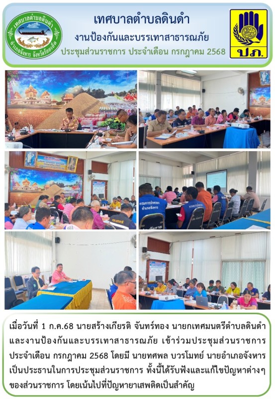 เมื่อวันที่ 1 ก.ค.68 นายสร้างเกียรติ จันทร์ทอง นายกเทศมนตรีตำบลดินดำและงานป้องกันและบรรเทาสาธารณภัย เข้าร่วมประชุมส่วนราชการประจำเดือน กรกฎาคม 2568 โดยมี นายทศพล บวรโมทย์ นายอำเภอจังหารเป็นประธานในการประชุมส่วนราชการ ทั้งนี้ได้รับฟังและแก้ไขปัญหาต่างๆของส่วนราชการ โดยเน้นไปที่ปัญหายาเสพติดเป็นสำคัญ