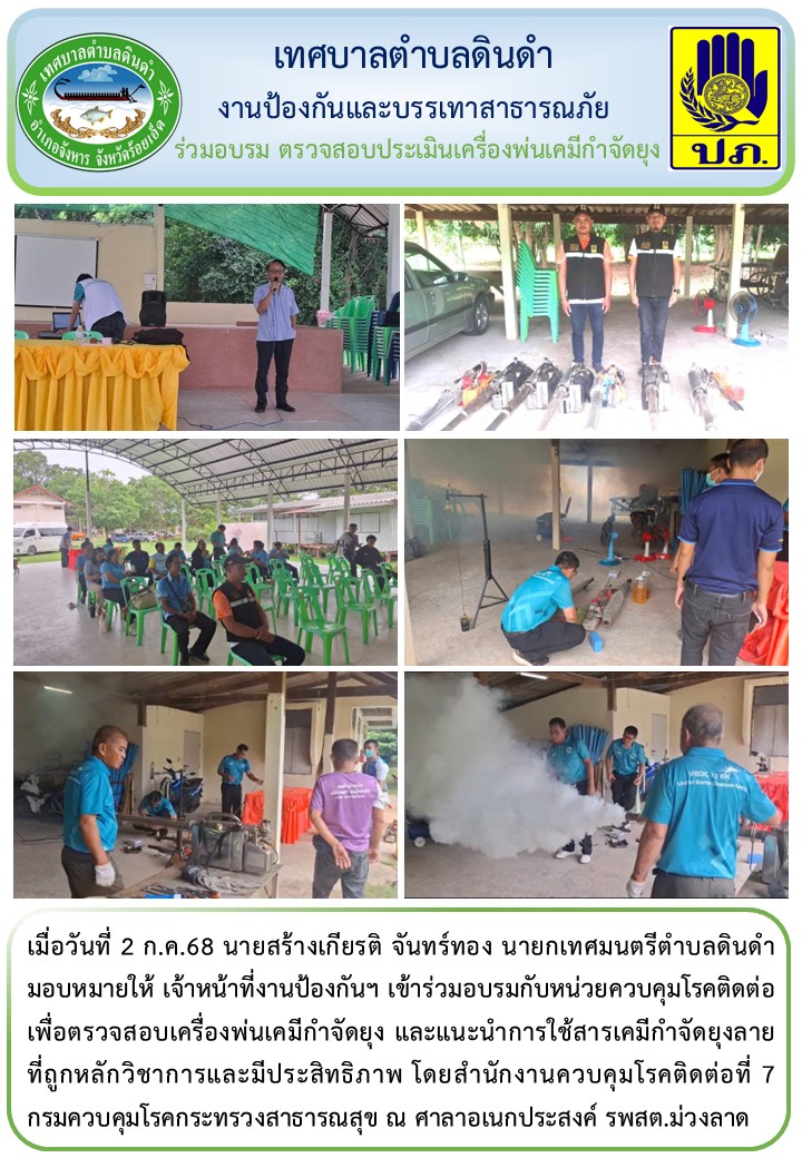 เมื่อวันที่ 2 ก.ค.68 นายสร้างเกียรติ จันทร์ทอง นายกเทศมนตรีตำบลดินดำมอบหมายให้ เจ้าหน้าที่งานป้องกันฯ เข้าร่วมอบรมกับหน่วยควบคุมโรคติดต่อ เพื่อตรวจสอบเครื่องพ่นเคมีกำจัดยุง และแนะนำการใช้สารเคมีกำจัดยุงลาย ที่ถูกหลักวิชาการและมีประสิทธิภาพ โดยสำนักงานควบคุมโรคติดต่อที่ 7 กรมควบคุมโรคกระทรวงสาธารณสุข ณ ศาลาอเนกประสงค์ รพสต.ม่วงลาด