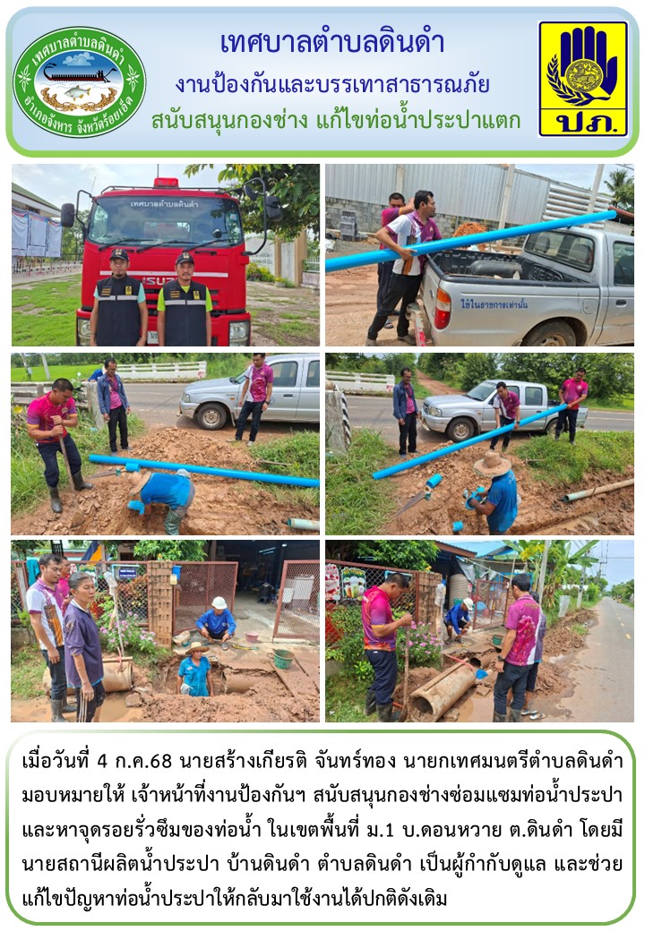 เมื่อวันที่ 4 ก.ค.68 นายสร้างเกียรติ จันทร์ทอง นายกเทศมนตรีตำบลดินดำมอบหมายให้ เจ้าหน้าที่งานป้องกันฯ สนับสนุนกองช่างซ่อมแซมท่อน้ำประปา และหาจุดรอยรั่วซึมของท่อน้ำ ในเขตพื้นที่ ม.1 บ.ดอนหวาย ต.ดินดำ โดยมีนายสถานีผลิตน้ำประปา บ้านดินดำ ตำบลดินดำ เป็นผู้กำกับดูแล และช่วยแก้ไขปัญหาท่อน้ำประปาให้กลับมาใช้งานได้ปกติดังเดิม
