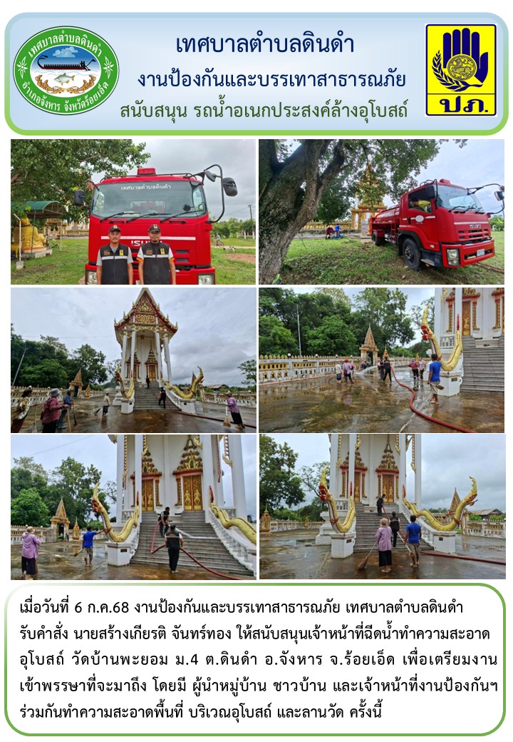 \r\nให้สนับสนุนเจ้าหน้าที่ป้องกันฯ ฉีดน้ำทำความสะอาดอุโบสถ์ วัดบ้านพะยอม ม.4 ต.ดินดำ อ.จังหาร จ.ร้อยเอ็ด เพื่อเตรียมงานเข้าพรรษาที่จะมาถึง โดยมี ผู้นำหมู่บ้าน ชาวบ้าน และเจ้าหน้าที่งานป้องกันฯ ร่วมกันทำความสะอาดพื้นที่ บริเวณอุโบสถ์ และลานวัด ครั้งนี้