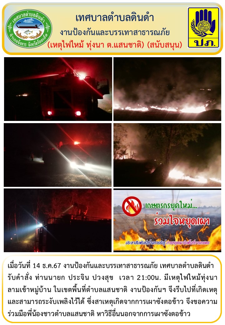 เมื่อวันที่ 14 ธ.ค.67 งานป้องกันและบรรเทาสาธารณภัย เทศบาลตำบลดินดำ รับคำสั่ง ท่านนายก ประจิน ปวงสุข เวลา 21:00น. มีเหตุไฟไหม้ ทุ่งนาลามเข้าหมู่บ้าน ในเขตพื้นที่ตำบลแสนชาติ งานป้องกันฯ จึงรีบไปที่เกิดเหตุและสามารถระงับเพลิงไว้ได้ ซึ่งสาเหตุเกิดจากการเผาซังตอข้าว จึงขอความร่วมมือพี่น้องชาวตำบลแสนชาติ หาวิธีอื่นนอกจากการเผาซังตอข้าว