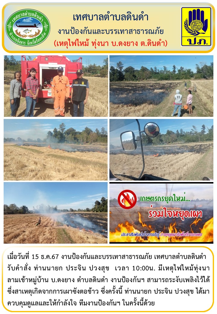 เมื่อวันที่ 15 ธ.ค.67 งานป้องกันและบรรเทาสาธารณภัย เทศบาลตำบลดินดำ รับคำสั่ง ท่านนายก ประจิน ปวงสุข เวลา 10:00น. มีเหตุไฟไหม้ ทุ่งนาลามเข้าหมู่บ้าน บ.ดงยาง ตำบลดินดำ งานป้องกันฯ สามารถระงับเพลิงไว้ได้ ซึ่งสาเหตุเกิดจากการเผาซังตอข้าว ซึ่งครั้งนี้ นางประจิน ปวงสุข นายกเทศมนตรีตำบลดินดำ ได้มาควบคุมดูแลและให้กำลังใจ ทีมงานป้องกันฯ ในครั้งนี้ด้วย