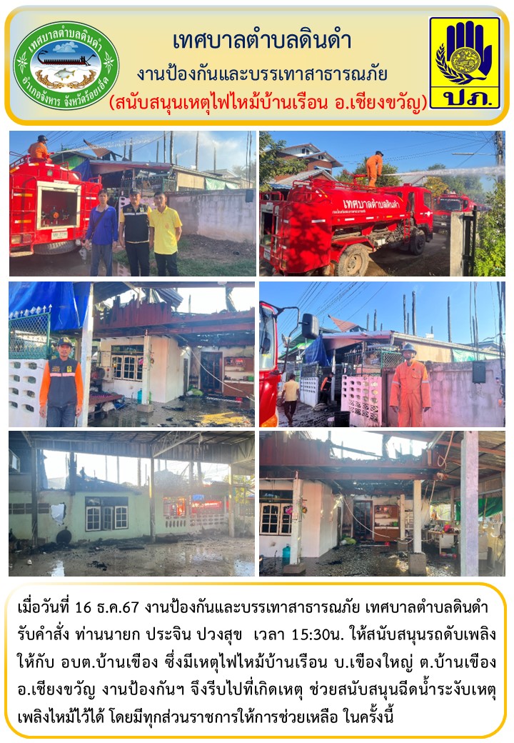 เมื่อวันที่ 16 ธ.ค.67 งานป้องกันและบรรเทาสาธารณภัย เทศบาลตำบลดินดำ รับคำสั่ง ท่านนายก ประจิน ปวงสุข เวลา 15:30น. ให้สนับสนุน รถดับเพลิง ให้กับ อบต.บ้านเขือง ซึ่งมีเหตุไฟไหม้บ้านเรือน บ.เขืองใหญ่ ต.บ้านเขือง อ.เชียงขวัญ งานป้องกันฯ จึงรีบไปที่เกิดเหตุ ช่วยสนับสนุนฉีดน้ำระงับเหตุเพลิงไหม้ไว้ได้ โดยมีทุกส่วนราชการให้การช่วยเหลือ ในครั้งนี้