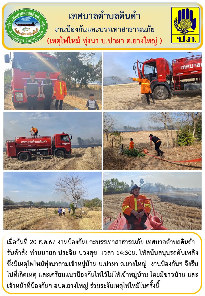 \r\nรับคำสั่ง ท่านนายก ประจิน ปวงสุข เวลา 14:30น. ให้สนับสนุนรถดับเพลิง ซึ่งมีเหตุไฟไหม้ทุ่งนาลามเข้าหมู่บ้าน บ.ปาผา ต.ยางใหญ่ งานป้องกันฯ จึงรีบไปที่เกิดเหตุ และเตรียมแนวป้องกันไฟไว้ไม่ให้เข้าหมู่บ้าน โดยมีชาวบ้าน และ เจ้าหน้าที่ป้องกันฯ อบต.ยางใหญ่ ร่วมระงับเหตุไฟไหม้ในครั้งนี้