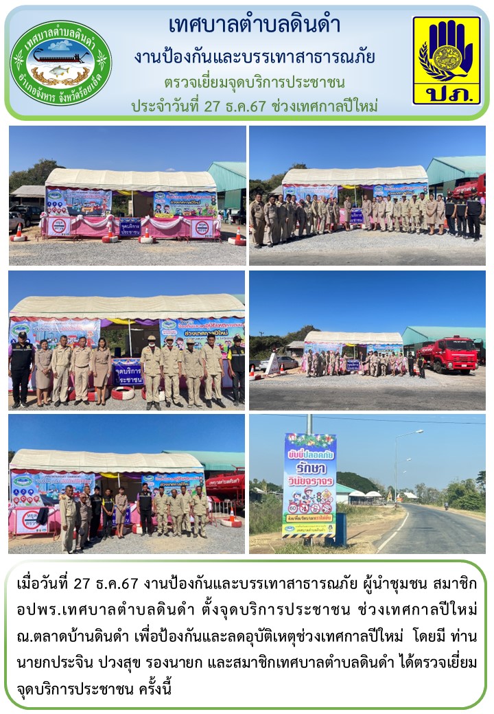 เมื่อวันที่ 27 ธ.ค.67 งานป้องกันและบรรเทาสาธารณภัย ผู้นำชุมชน สมาชิก อปพร.เทศบาลตำบลดินดำ ตั้งจุดบริการประชาชน ช่วงเทศกาลปีใหม่ ณ.ตลาดบ้านดินดำ เพื่อป้องกันและลดอุบัติเหตุช่วงเทศกาลปีใหม่ โดยมี ท่านนายกประจิน ปวงสุข รองนายก และสมาชิกเทศบาลตำบลดินดำ ได้ตรวจเยียมจุดบริการประชาชน ครั้งนี้
