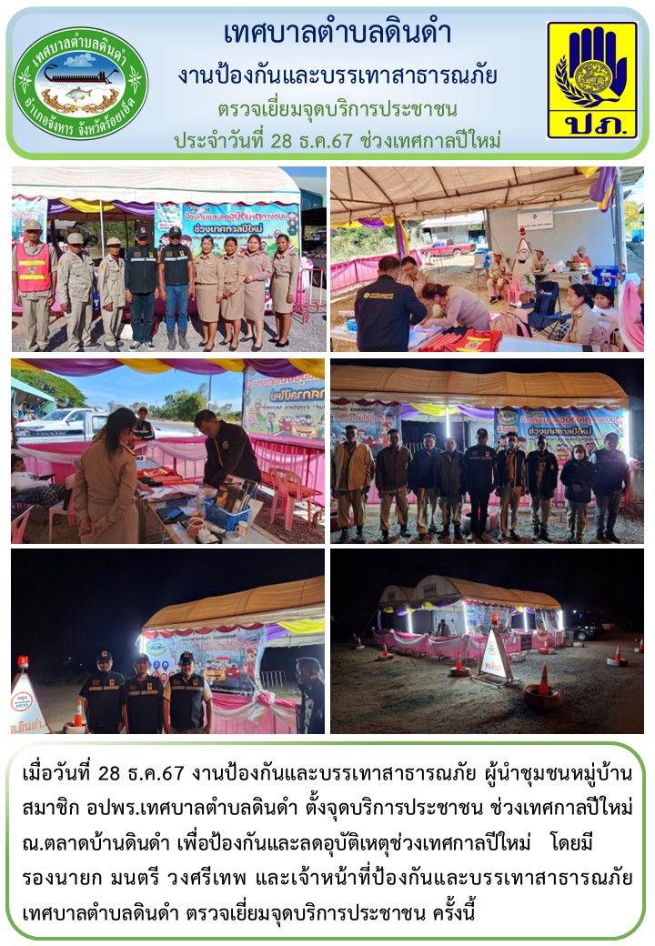 เมื่อวันที่ 28 ธ.ค.67 งานป้องกันและบรรเทาสาธารณภัย ผู้นำชุมชนหมู่บ้าน สมาชิก อปพร.เทศบาลตำบลดินดำ ตั้งจุดบริการประชาชน ช่วงเทศกาลปีใหม่ ณ.ตลาดบ้านดินดำ เพื่อป้องกันและลดอุบัติเหตุช่วงเทศกาลปีใหม่ โดยมี รองนายก มนตรี วงศรีเทพ และเจ้าหน้าที่ป้องกันและบรรเทาสาธารณภัยเทศบาลตำบลดินดำ ตรวจเยี่ยมจุดบริการประชาชน ครั้งนี้