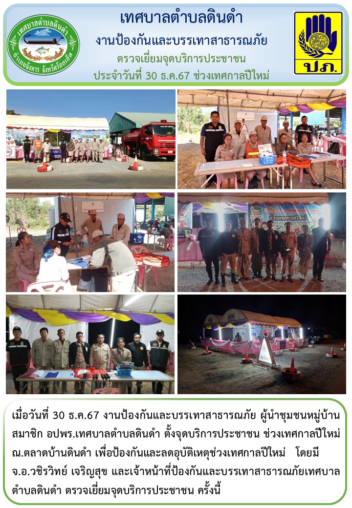 เมื่อวันที่ 30 ธ.ค.67 งานป้องกันและบรรเทาสาธารณภัย ผู้นำชุมชนหมู่บ้าน สมาชิก อปพร.เทศบาลตำบลดินดำ ตั้งจุดบริการประชาชน