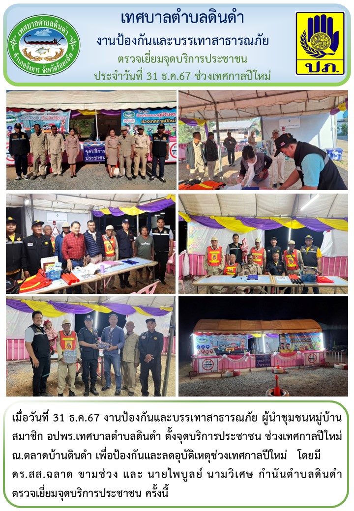เมื่อวันที่ 31 ธ.ค.67 งานป้องกันและบรรเทาสาธารณภัย ผู้นำชุมชนหมู่บ้าน สมาชิก อปพร.เทศบาลตำบลดินดำ ตั้งจุดบริการประชาชน ช่วงเทศกาลปีใหม่ ณ.ตลาดบ้านดินดำ เพื่อป้องกันและลดอุบัติเหตุช่วงเทศกาลปีใหม่ โดยมี ดร.สส.ฉลาด ขามช่วง และ นายไพบูลย์ นามวิเศษ