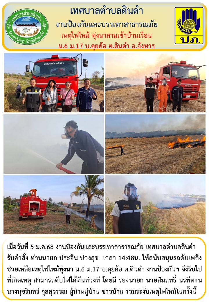 \r\nรับคำสั่ง ท่านนายก ประจิน ปวงสุข เวลา 14:48น. ให้สนับสนุนรถดับเพลิง ช่วยเหลือเหตุไฟไหม้ทุ่งนา ม.6 ม.17 บ.คุยค้อ ต.ดินดำ งานป้องกันฯ จึงรีบไปที่เกิดเหตุ สามารถดับไฟได้ทันท่วงที โดยมี รองนายก นายสัมฤทธิ์ นรทีทาน นางนุชรินทร์ กุลสุวรรณ ผู้นำหมู่บ้าน ชาวบ้าน ร่วมระงับเหตุไฟไหม้ในครั้งนี้
