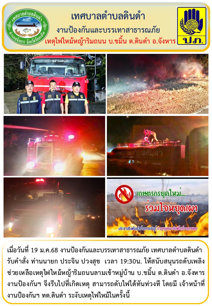 \r\nรับคำสั่ง ท่านนายก ประจิน ปวงสุข เวลา 19:30น. ให้สนับสนุนรถดับเพลิง ช่วยเหลือเหตุไฟไหม้หญ้าริมถนนลามเข้าหมู่บ้าน บ.ขมิ้น ต.ดินดำ อ.จังหาร งานป้องกันฯ จึงรีบไปที่เกิดเหตุ สามารถดับไฟได้ทันท่วงที โดยมี เจ้าหน้าที่งานป้องกันฯ ทต.ดินดำ ระงับเหตุไฟไหม้ในครั้งนี้