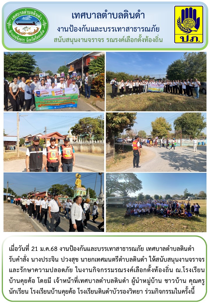 \r\nรับคำสั่ง นางประจิน ปวงสุข นายกเทศมนตรีตำบลดินดำ ให้สนับสนุนงานจราจร และรักษาความปลอดภัย ในงานกิจกรรมรณรงค์เลือกตั้งท้องถิ่น ณ.โรงเรียนบ้านคุยค้อ โดยมี เจ้าหน้าที่เทศบาลตำบลดินดำ ผู้นำหมู่บ้าน ชาวบ้าน คุณครู นักเรียน โรงเรียนบ้านคุยค้อ โรงเรียนดินดำบัวรองวิทยา ร่วมกิจกรรมในครั้งนี้