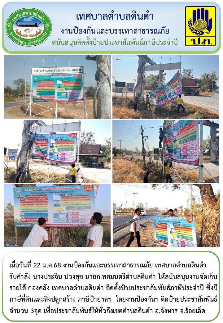 \r\nรับคำสั่ง นางประจิน ปวงสุข นายกเทศมนตรีตำบลดินดำ ให้สนับสนุนงานจัดเก็บรายได้ กองคลัง เทศบาลตำบลดินดำ ติดตั้งป้ายประชาสัมพันธ์ภาษีประจำปี ซึ่งมี ภาษีที่ดินและสิ่งปลูกสร้าง ภาษีป้ายฯลฯ โดยงานป้องกันฯ ติดป้ายประชาสัมพันธ์