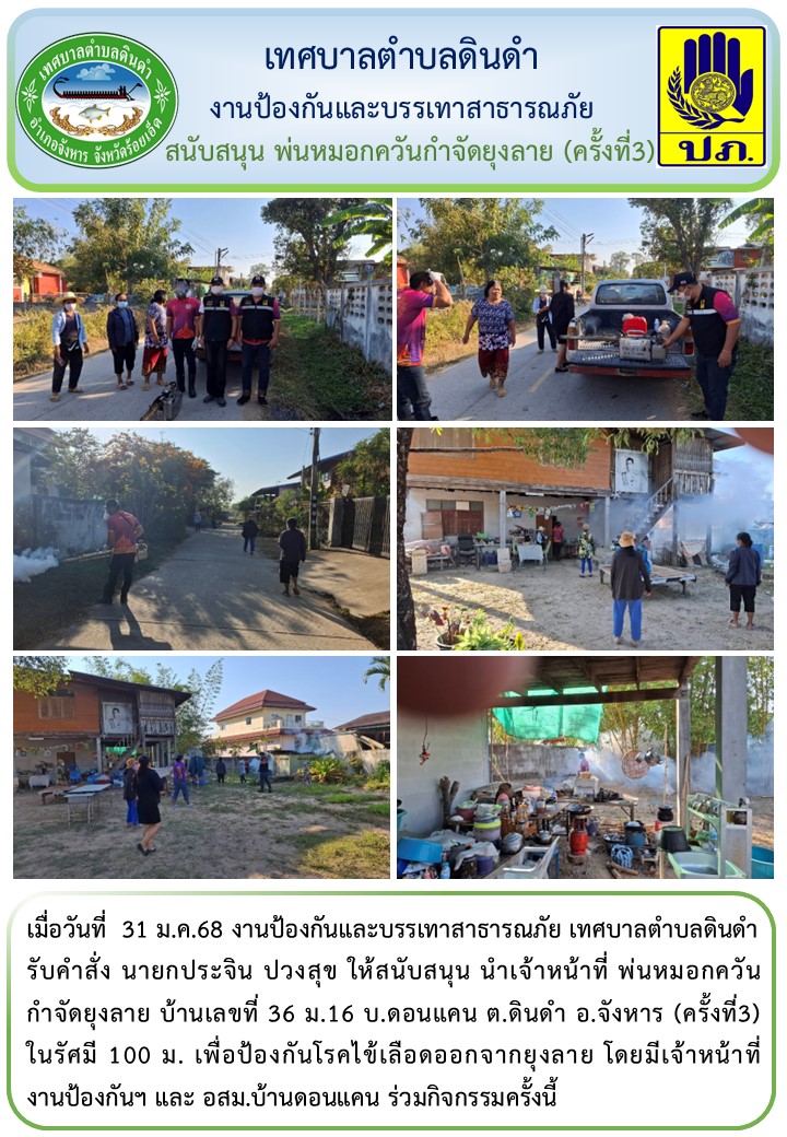 \r\nรับคำสั่ง นายกประจิน ปวงสุข ให้สนับสนุน นำเจ้าหน้าที่ พ่นหมอกควันกำจัดยุงลาย บ้านเลขที่ 36 ม.16 บ.ดอนแคน ต.ดินดำ อ.จังหาร (ครั้งที่3) ในรัศมี 100 ม. เพื่อป้องกันโรคไข้เลือดออกจากยุงลาย โดยมีเจ้าหน้าที่งานป้องกันฯ และ อสม.บ้านดอนแคน ร่วมกิจกรรมครั้งนี้