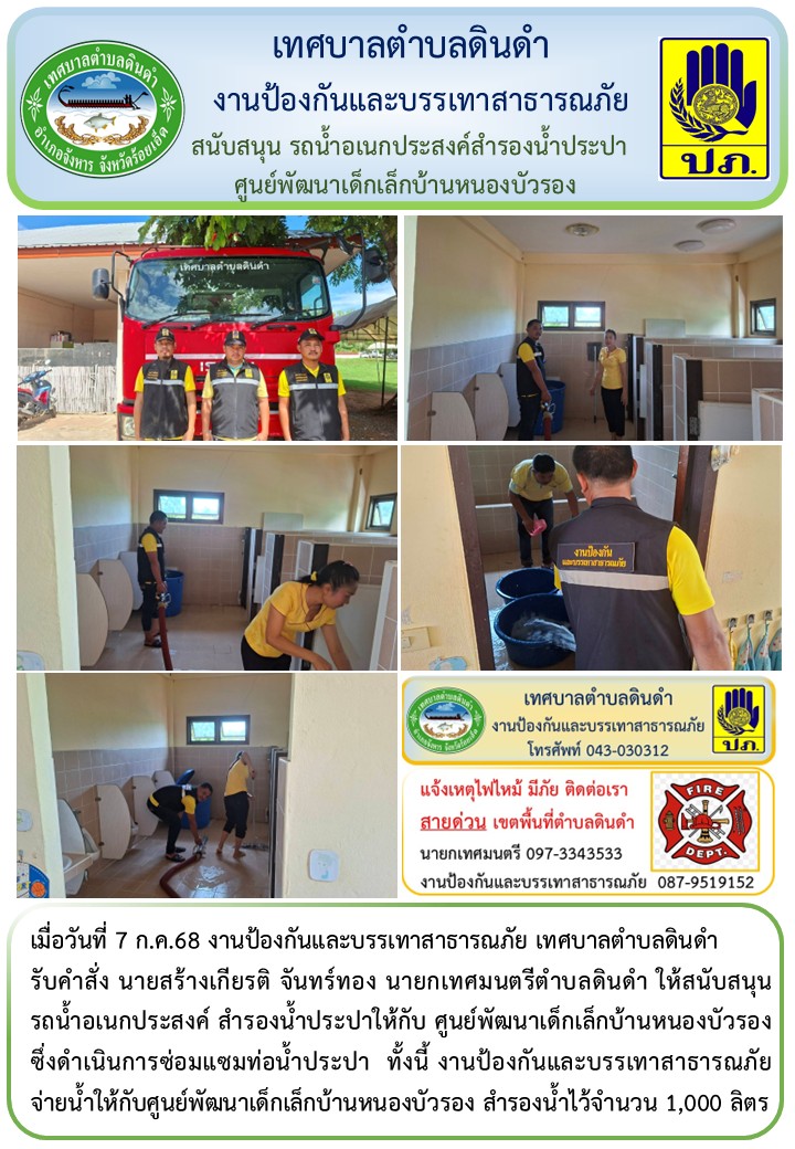 \r\nรับคำสั่ง นายสร้างเกียรติ จันทร์ทอง นายกเทศมนตรีตำบลดินดำ ให้สนับสนุน รถน้ำอเนกประสงค์ สำรองน้ำประปาให้กับ ศูนย์พัฒนาเด็กเล็กบ้านหนองบัวรองซึ่งดำเนินการซ่อมแซมท่อน้ำประปา ทั้งนี้ งานป้องกันและบรรเทาสาธารณภัยจ่ายน้ำให้กับศูนย์พัฒนาเด็กเล็กบ้านหนองบัวรอง สำรองน้ำไว้จำนวน 1,000 ลิตร