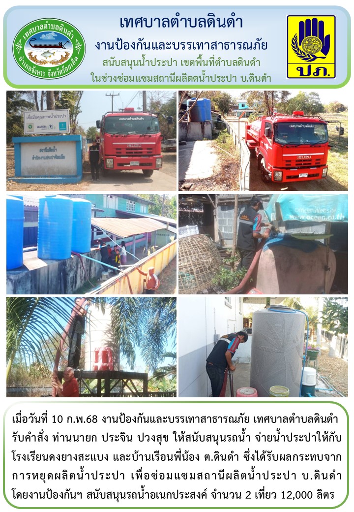 \r\nรับคำสั่ง ท่านนายก ประจิน ปวงสุข ให้สนับสนุนรถน้ำ จ่ายน้ำประปาให้กับ โรงเรียนดงยางสะแบง และบ้านเรือนพี่น้อง ต.ดินดำ ซึ่งได้รับผลกระทบจากการหยุดผลิตน้ำประปา เพื่อซ่อมแซมสถานีผลิตน้ำประปา บ.ดินดำ โดยงานป้องกันฯ สนับสนุนรถน้ำอเนกประสงค์ จำนวน 2 เที่ยว 12,000 ลิตร