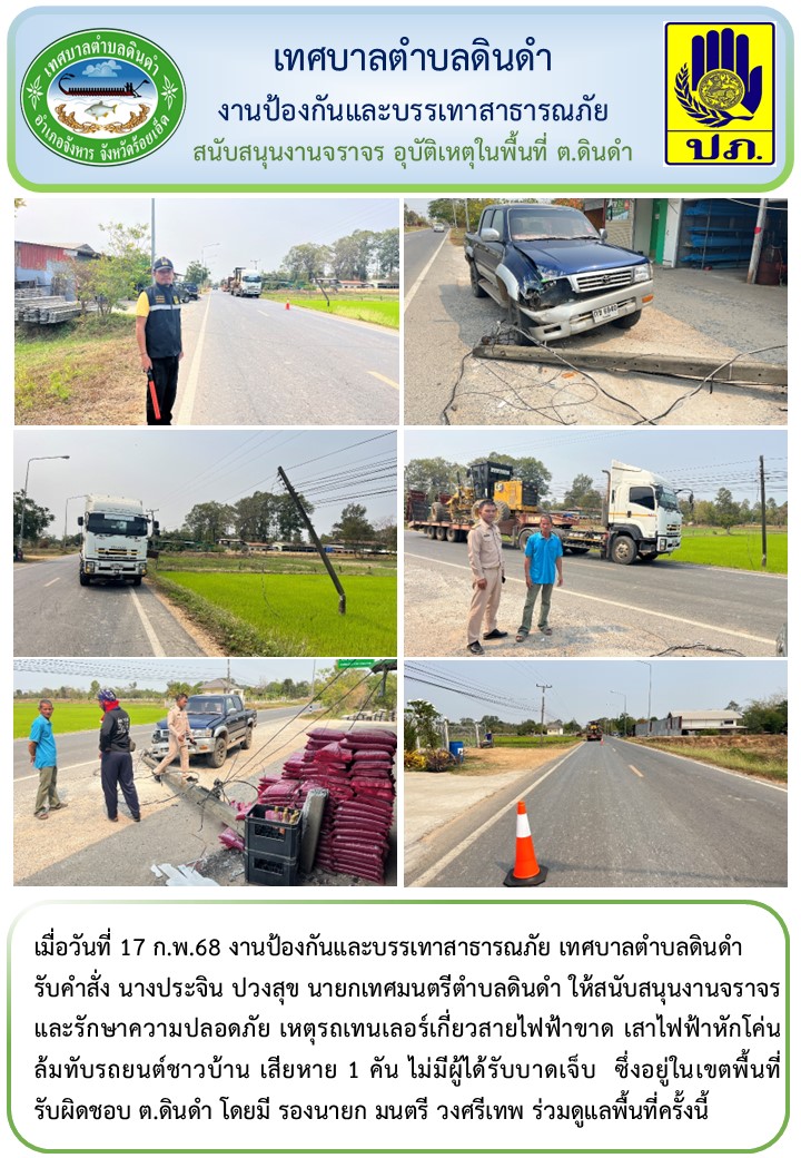 \r\nรับคำสั่ง นางประจิน ปวงสุข นายกเทศมนตรีตำบลดินดำ ให้สนับสนุนงานจราจร และรักษาความปลอดภัย เหตุรถเทนเลอร์เกี่ยวสายไฟฟ้าขาด เสาไฟฟ้าหักโค่น ล้มทับรถยนต์ชาวบ้าน เสียหาย 1 คัน ไม่มีผู้ได้รับบาดเจ็บ ซึ่งอยู่ในเขตพื้นที่รับผิดชอบ ต.ดินดำ โดยมี รองนายก มนตรี วงศรีเทพ ร่วมดูแลพื้นที่ครั้งนี้