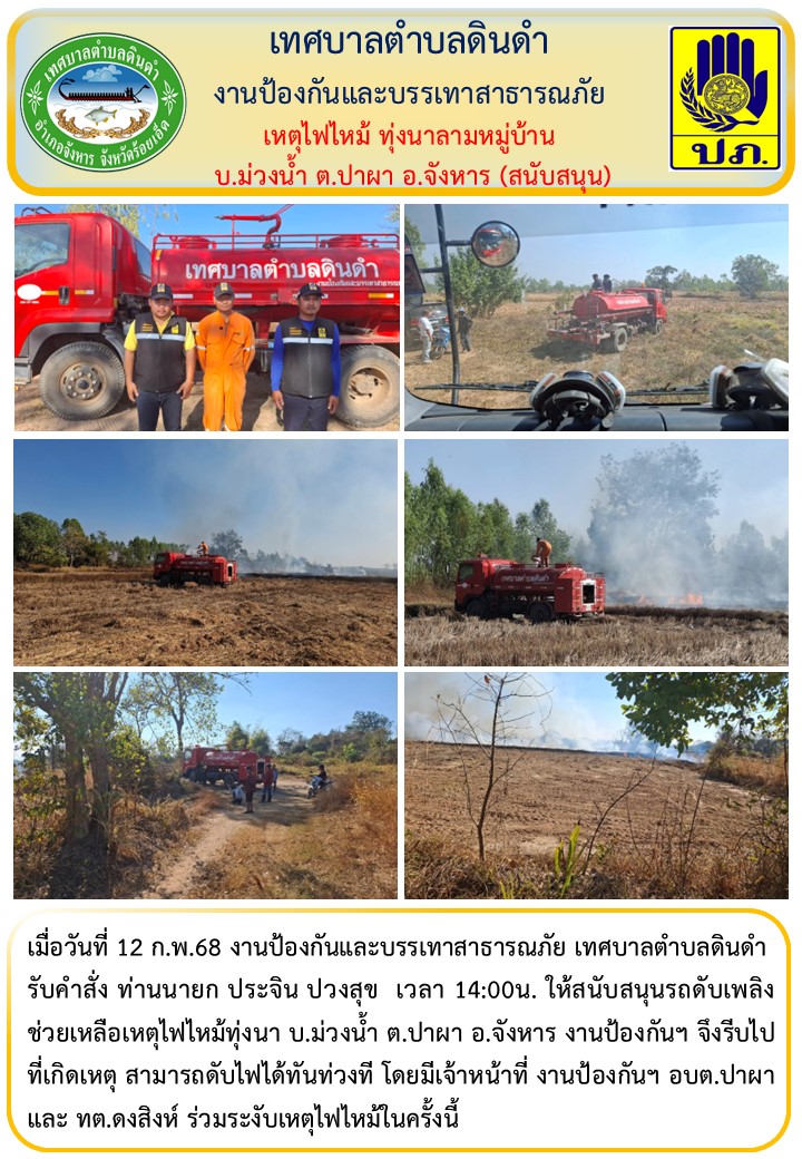 \r\nรับคำสั่ง ท่านนายก ประจิน ปวงสุข เวลา 14:00น. ให้สนับสนุนรถดับเพลิง ช่วยเหลือเหตุไฟไหม้ทุ่งนา บ.ม่วงน้ำ ต.ปาผา อ.จังหาร งานป้องกันฯ จึงรีบไปที่เกิดเหตุ สามารถดับไฟได้ทันท่วงที โดยมีเจ้าหน้าที่ งานป้องกันฯ อบต.ปาผา และ ทต.ดงสิงห์ ร่วมระงับเหตุไฟไหม้ในครั้งนี้