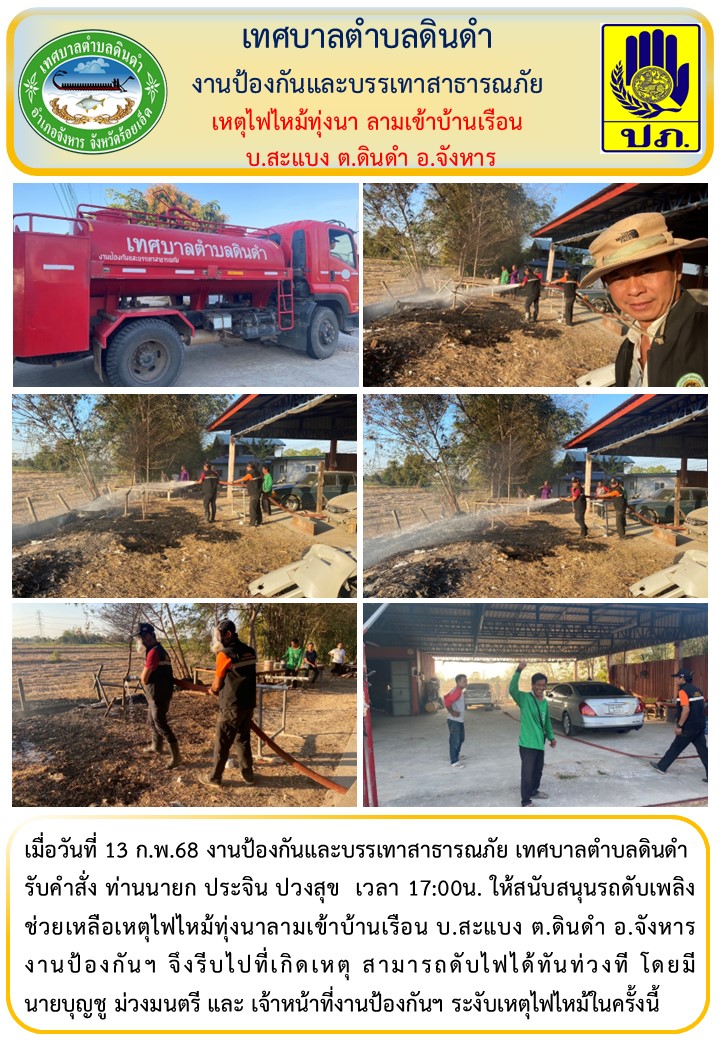 \r\nรับคำสั่ง ท่านนายก ประจิน ปวงสุข เวลา 17:00น. ให้สนับสนุนรถดับเพลิง ช่วยเหลือเหตุไฟไหม้ทุ่งนาลามเข้าบ้านเรือน บ.สะแบง ต.ดินดำ อ.จังหาร จ.ร้อยเอ็ด งานป้องกันฯ จึงรีบไปที่เกิดเหตุ สามารถดับไฟได้ทันท่วงที โดยมี นายบุญชู ม่วงมนตรี และ เจ้าหน้าที่งานป้องกันฯ ระงับเหตุไฟไหม้ในครั้งนี้