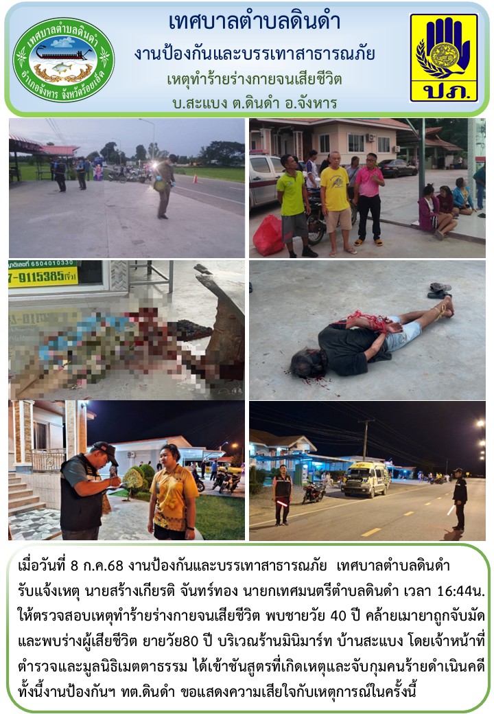 \r\nรับแจ้งเหตุ นายสร้างเกียรติ จันทร์ทอง นายกเทศมนตรีตำบลดินดำ เวลา 16:44น. ให้ตรวจสอบเหตุทำร้ายร่างกายจนเสียชีวิต พบชายวัย 40 ปี คล้ายเมายาถูกจับมัดและพบร่างผู้เสียชีวิต ยายวัย80 ปี บริเวณร้านมินิมาร์ท บ้านสะแบง โดยเจ้าหน้าที่ตำรวจและมูลนิธิเมตตาธรรม ได้เข้าชันสูตรที่เกิดเหตุและจับกุมคนร้ายดำเนินคดี ทั้งนี้งานป้องกันฯ ทต.ดินดำ ขอแสดงความเสียใจกับเหตุการณ์ในครั้งนี้