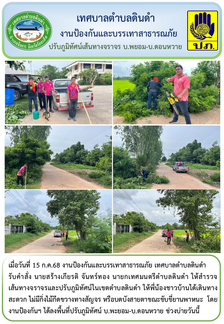 \r\nรับคำสั่ง นายสร้างเกียรติ จันทร์ทอง นายกเทศมนตรีตำบลดินดำ ให้สำรวจเส้นทางจราจรและปรับภูมิทัศน์ในเขตตำบลดินดำ ให้พี่น้องชาวบ้านได้เดินทางสะดวก ไม่มีกิ่งไม้กีดขวางทางสัญจร หรือบดบังสายตาขณะขับขี่ยานพาหนะ โดยงานป้องกันฯ ได้ลงพื้นที่ปรับภูมิทัศน์ บ.พะยอม-บ.ดอนหวาย ช่วงบ่ายวันนี้