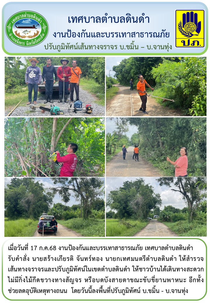 \r\nรับคำสั่ง นายสร้างเกียรติ จันทร์ทอง นายกเทศมนตรีตำบลดินดำ ให้สำรวจเส้นทางจราจรและปรับภูมิทัศน์ในเขตตำบลดินดำ ให้ชาวบ้านได้เดินทางสะดวก ไม่มีกิ่งไม้กีดขวางทางสัญจร หรือบดบังสายตาขณะขับขี่ยานพาหนะ อีกทั้งช่วยลดอุบัติเหตุทางถนน โดยวันนี้ลงพื้นที่ปรับภูมิทัศน์ บ.ขมิ้น - บ.จานทุ่ง