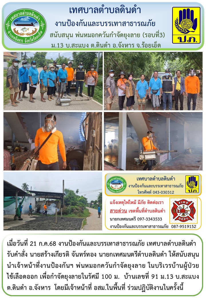 \r\nรับคำสั่ง นายสร้างเกียรติ จันทร์ทอง นายกเทศมนตรีตำบลดินดำ ให้สนับสนุนนำเจ้าหน้าที่งานป้องกันฯ พ่นหมอกควันกำจัดยุงลาย ในบริเวรบ้านผู้ป่วยไข้เลือดออก เพื่อกำจัดยุงลายในรัศมี 100 ม. บ้านเลขที่ 91 ม.13 บ.สะแบง ต.ดินดำ อ.จังหาร โดยมีเจ้าหน้าที่ อสม.ในพื้นที่ ร่วมปฏิบัติงานในครั้งนี้