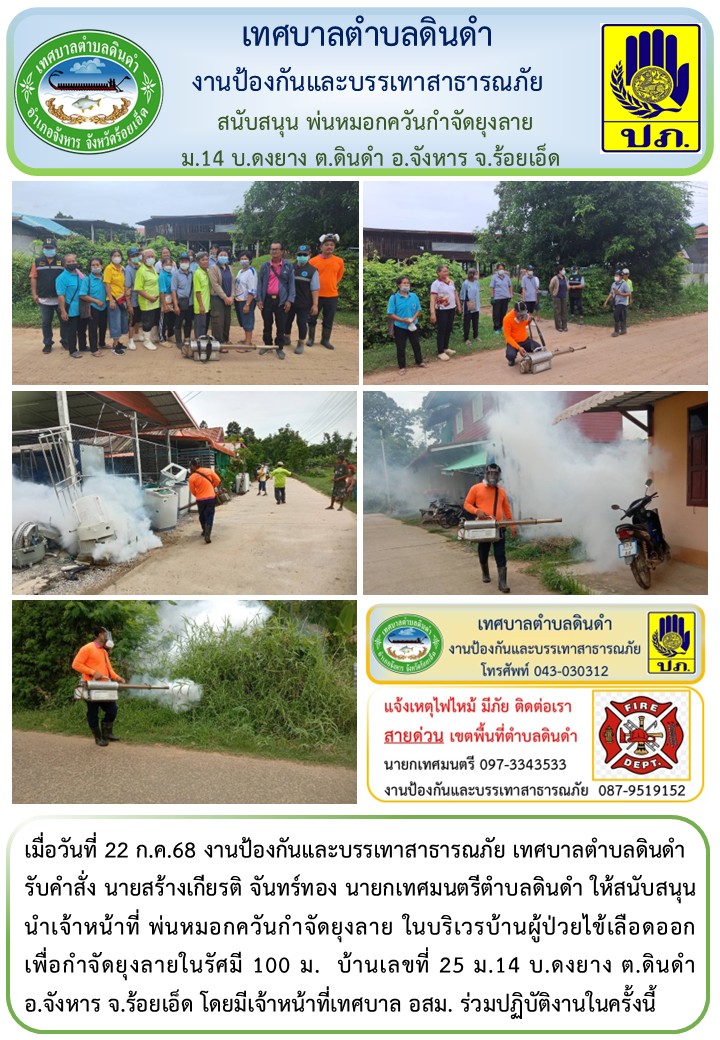 \r\nรับคำสั่ง นายสร้างเกียรติ จันทร์ทอง นายกเทศมนตรีตำบลดินดำ ให้สนับสนุนนำเจ้าหน้าที่ พ่นหมอกควันกำจัดยุงลาย ในบริเวรบ้านผู้ป่วย ไข้เลือดออก เพื่อกำจัดยุงลายในรัศมี 100 ม. บ้านเลขที่ 25 ม.14 บ.ดงยาง ต.ดินดำ อ.จังหาร จ.ร้อยเอ็ด โดยมีเจ้าหน้าที่เทศบาล อสม. ร่วมปฏิบัติงานในครั้งนี้