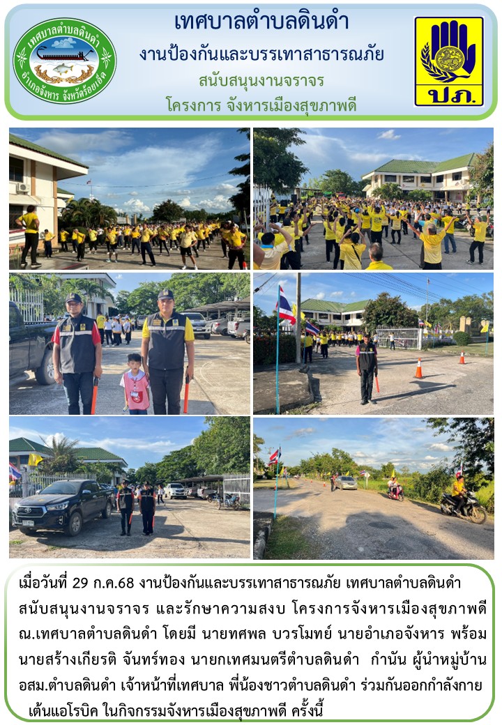 \r\nสนับสนุนงานจราจร และรักษาความสงบ โครงการจังหารเมืองสุขภาพดี ณ.เทศบาลตำบลดินดำ โดยมี นายทศพล บวรโมทย์ นายอำเภอจังหาร พร้อม นายสร้างเกียรติ จันทร์ทอง นายกเทศมนตรีตำบลดินดำ กำนัน ผู้นำหมู่บ้าน อสม.ตำบลดินดำ เจ้าหน้าที่เทศบาล พี่น้องชาวตำบลดินดำ ร่วมกันออกกำลังกายเต้นแอโรบิค ในกิจกรรมจังหารเมืองสุขภาพดี ครั้งนี้