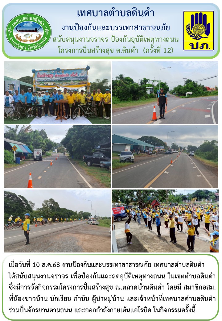 \r\nได้สนับสนุนงานจราจร เพื่อป้องกันและลดอุบัติเหตุทางถนน ในเขตตำบลดินดำ ซึ่งมีการจัดกิจกรรมโครงการปั่นสร้างสุข ณ.ตลาดบ้านดินดำ โดยมี สมาชิกอสม. พี่น้องชาวบ้าน นักเรียน กำนัน ผู้นำหมู่บ้าน และเจ้าหน้าที่เทศบาลตำบลดินดำร่วมปั่นจักรยานตามถนน และออกกำลังกายเต้นแอโรบิค ในกิจกรรมครั้งนี้