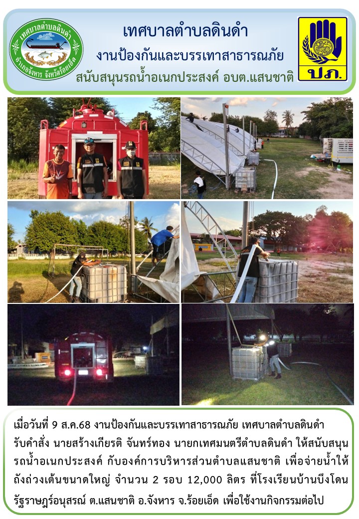 \r\nรับคำสั่ง นายสร้างเกียรติ จันทร์ทอง นายกเทศมนตรีตำบลดินดำ ให้สนับสนุนรถน้ำอเนกประสงค์ กับองค์การบริหารส่วนตำบลแสนชาติ เพื่อจ่ายน้ำให้ถังถ่วงเต้นขนาดใหญ่ จำนวน 2 รอบ 12,000 ลิตร ที่โรงเรียนบ้านบึงโดนรัฐราษฎร์อนุสรณ์ ต.แสนชาติ อ.จังหาร จ.ร้อยเอ็ด เพื่อใช้งานกิจกรรมต่อไป