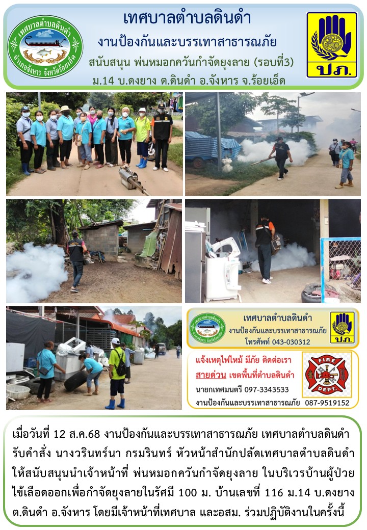 \r\nรับคำสั่ง นางวรินทร์นา กรมรินทร์ หัวหน้าสำนักปลัดเทศบาลตำบลดินดำ ให้สนับสนุนนำเจ้าหน้าที่ พ่นหมอกควันกำจัดยุงลาย ในบริเวรบ้านผู้ป่วยไข้เลือดออกเพื่อกำจัดยุงลายในรัศมี 100 ม. บ้านเลขที่ 116 ม.14 บ.ดงยาง ต.ดินดำ อ.จังหาร โดยมีเจ้าหน้าที่เทศบาล และอสม. ร่วมปฏิบัติงานในครั้งนี้