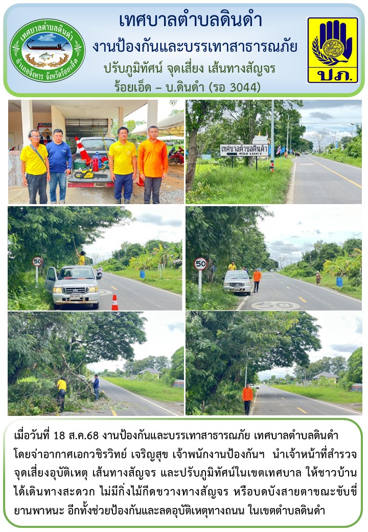 \r\nโดยจ่าอากาศเอกวชิรวิทย์ เจริญสุข เจ้าพนักงานป้องกันฯ นำเจ้าหน้าที่สำรวจ จุดเสี่ยงอุบัติเหตุ เส้นทางสัญจร และปรับภูมิทัศน์ในเขตเทศบาล ให้ชาวบ้านได้เดินทางสะดวก ไม่มีกิ่งไม้กีดขวางทางสัญจร หรือบดบังสายตาขณะขับขี่ยานพาหนะ อีกทั้งช่วยป้องกันและลดอุบัติเหตุทางถนน ในเขตตำบลดินดำ