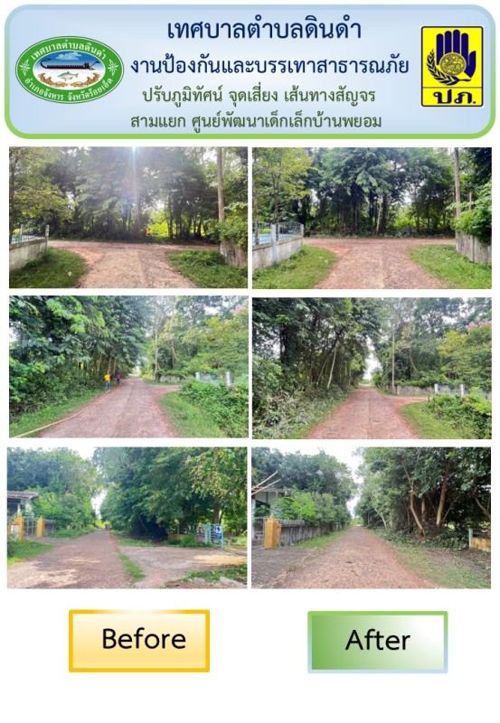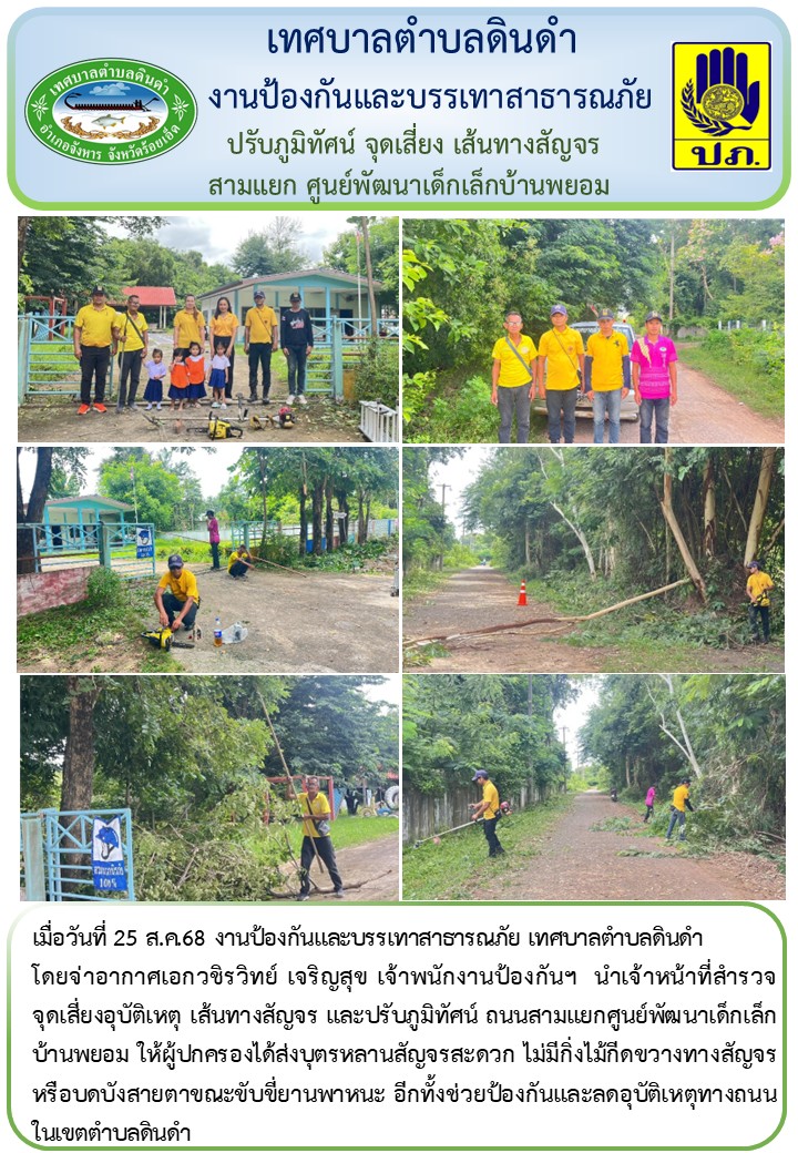 \r\nโดยจ่าอากาศเอกวชิรวิทย์ เจริญสุข เจ้าพนักงานป้องกันฯ นำเจ้าหน้าที่สำรวจจุดเสี่ยงอุบัติเหตุ เส้นทางสัญจร และปรับภูมิทัศน์ ถนนสามแยกศูนย์พัฒนาเด็กเล็กบ้านพยอม ให้ผู้ปกครองได้ส่งบุตรหลานสัญจรสะดวก ไม่มีกิ่งไม้กีดขวางทางสัญจร หรือบดบังสายตาขณะขับขี่ยานพาหนะ อีกทั้งช่วยป้องกันและลดอุบัติเหตุทางถนนในเขตตำบลดินดำ