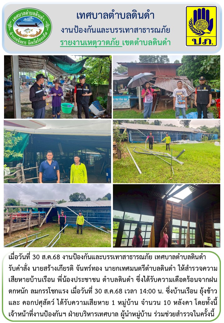 \r\nรับคำสั่ง นายสร้างเกียรติ จันทร์ทอง นายกเทศมนตรีตำบลดินดำ ให้สำรวจความเสียหายบ้านเรือน พี่น้องประชาชน ตำบลดินดำ ซึ่งได้รับความเดือดร้อนจากฝนตกหนัก ลมกรรโชกแรง เมื่อวันที่ 30 ส.ค.68 เวลา 14:00 น. ซึ่งบ้านเรือน ยุ้งข้าวและ คอกปศุสัตว์ ได้รับความเสียหาย 1 หมู่บ้าน จำนวน 10 หลังคา โดยทั้งนี้เจ้าหน้าที่งานป้องกันฯ ฝ่ายบริหารเทศบาล ผู้นำหมู่บ้าน ร่วมช่วยสำรวจในครั้งนี้