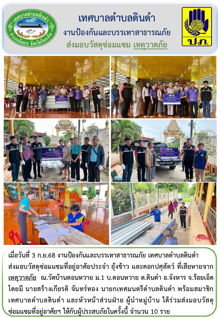 \r\nส่งมอบวัสดุซ่อมแซมที่อยู่อาศัยประจำ ยุ้งข้าว และคอกปศุสัตว์ ที่เสียหายจาก เหตุวาตภัย <span style="\"font-size:" 13px;\"="">ณ.วัดบ้านดอนหวาย ม.1 บ.ดอนหวาย ต.ดินดำ อ.จังหาร จ.ร้อยเอ็ด โดยมี นายสร้างเกียรติ จันทร์ทอง นายกเทศมนตรีตำบลดินดำ พร้อมสมาชิกเทศบาลตำบลดินดำ และหัวหน้าส่วนฝ่าย ผู้นำหมู่บ้าน ได้ร่วมส่งมอบวัสดุซ่อมแซมที่อยู่อาศัยฯ ให้กับผู้ประสบภัยในครั้งนี้ จำนวน 10 ราย