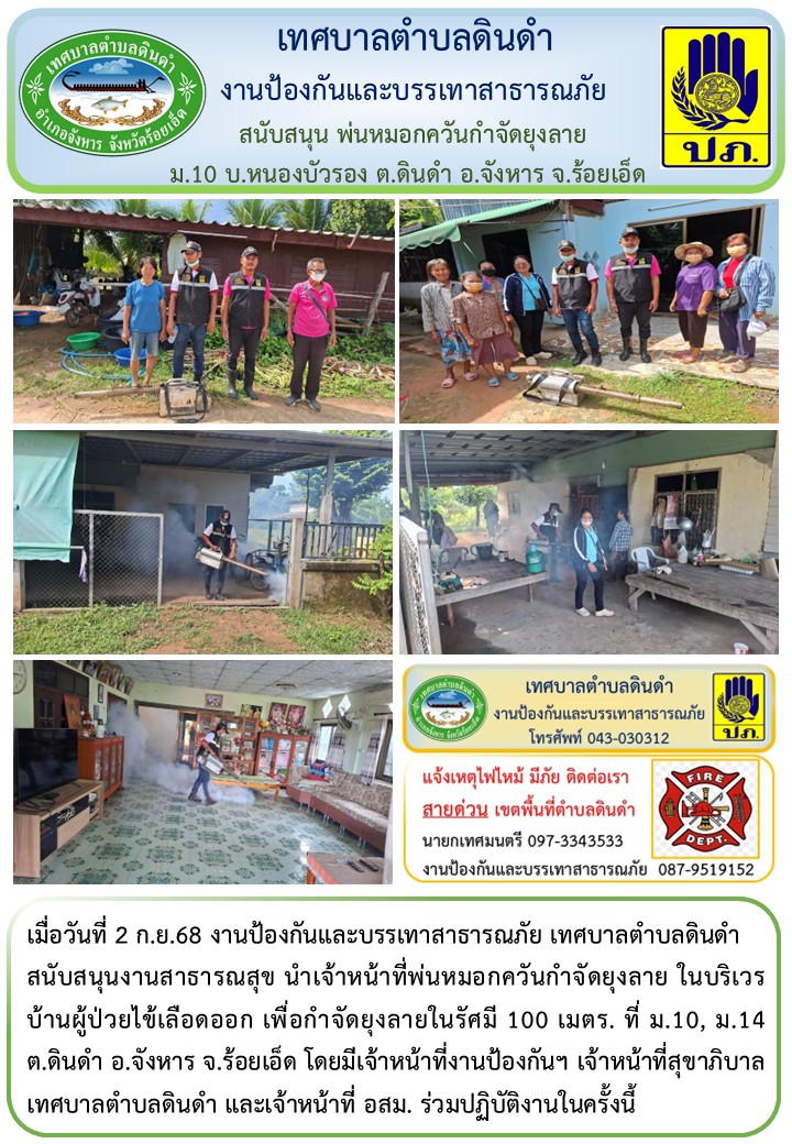 \r\nสนับสนุนงานสาธารณสุข นำเจ้าหน้าที่พ่นหมอกควันกำจัดยุงลาย ในบริเวรบ้านผู้ป่วยไข้เลือดออก เพื่อกำจัดยุงลายในรัศมี 100 เมตร. ที่ ม.10, ม.14 ต.ดินดำ อ.จังหาร จ.ร้อยเอ็ด โดยมีเจ้าหน้าที่งานป้องกันฯ เจ้าหน้าที่สุขาภิบาลเทศบาลตำบลดินดำ และเจ้าหน้าที่ อสม. ร่วมปฏิบัติงานในครั้งนี้