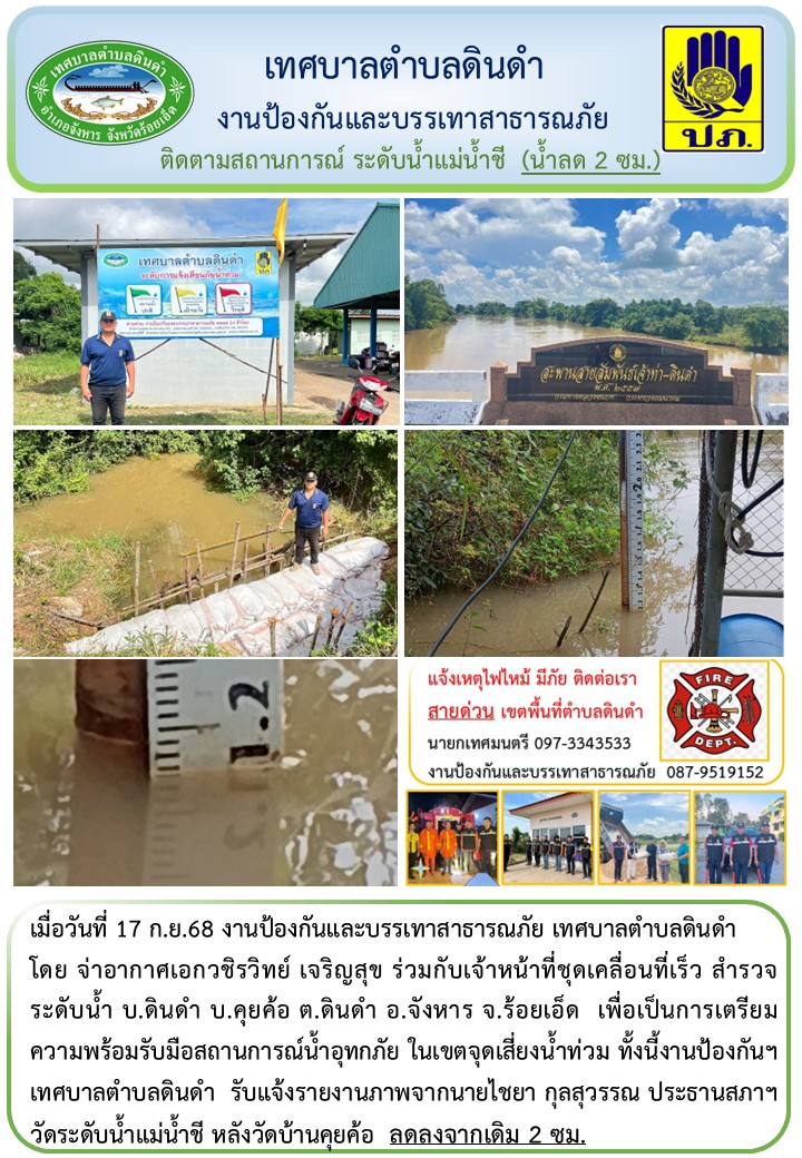 \r\nโดย จ่าอากาศเอกวชิรวิทย์ เจริญสุข ร่วมกับเจ้าหน้าที่ชุดเคลื่อนที่เร็ว สำรวจระดับน้ำ บ.ดินดำ บ.คุยค้อ ต.ดินดำ อ.จังหาร จ.ร้อยเอ็ด เพื่อเป็นการเตรียมความพร้อมรับมือสถานการณ์น้ำอุทกภัย ในเขตจุดเสี่ยงน้ำท่วม ทั้งนี้งานป้องกันฯเทศบาลตำบลดินดำ รับแจ้งรายงานภาพจากนายไชยา กุลสุวรรณ ประธานสภาฯ วัดระดับน้ำแม่น้ำชี หลังวัดบ้านคุยค้อ ลดลงจากเดิม 2 ซม.