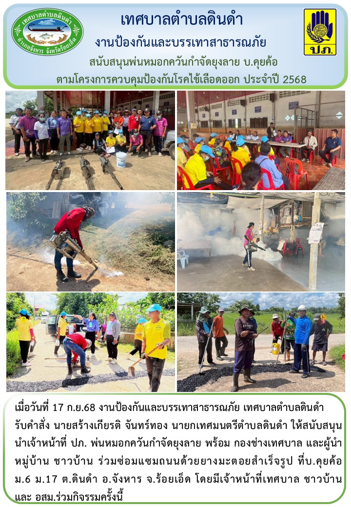 \r\nรับคำสั่ง นายสร้างเกียรติ จันทร์ทอง นายกเทศมนตรีตำบลดินดำ ให้สนับสนุนนำเจ้าหน้าที่ ปภ. พ่นหมอกควันกำจัดยุงลาย พร้อม กองช่างเทศบาล และผู้นำหมู่บ้าน ชาวบ้าน ร่วมซ่อมแซมถนนด้วยยางมะตอยสำเร็จรูป ที่บ.คุยค้อ ม.6 ม.17 ต.ดินดำ อ.จังหาร จ.ร้อยเอ็ด โดยมีเจ้าหน้าที่เทศบาล ชาวบ้าน และ อสม.ร่วมกิจรรมครั้งนี้