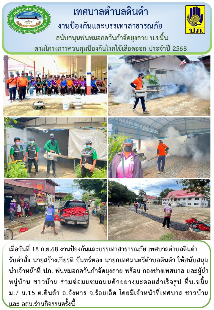 \r\nรับคำสั่ง นายสร้างเกียรติ จันทร์ทอง นายกเทศมนตรีตำบลดินดำ ให้สนับสนุนนำเจ้าหน้าที่ ปภ. พ่นหมอกควันกำจัดยุงลาย พร้อม กองช่างเทศบาล และผู้นำหมู่บ้าน ชาวบ้าน ร่วมซ่อมแซมถนนด้วยยางมะตอยสำเร็จรูป ที่บ.ขมิ้น ม.7 ม.15 ต.ดินดำ อ.จังหาร จ.ร้อยเอ็ด โดยมีเจ้าหน้าที่เทศบาล ชาวบ้าน และ อสม.ร่วมกิจรรมครั้งนี้