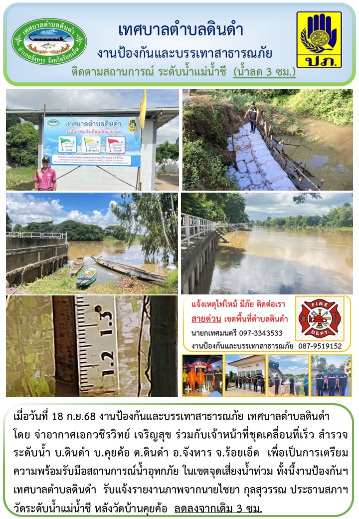 \r\nโดย จ่าอากาศเอกวชิรวิทย์ เจริญสุข ร่วมกับเจ้าหน้าที่ชุดเคลื่อนที่เร็ว สำรวจระดับน้ำ บ.ดินดำ บ.คุยค้อ ต.ดินดำ อ.จังหาร จ.ร้อยเอ็ด เพื่อเป็นการเตรียมความพร้อมรับมือสถานการณ์น้ำอุทกภัย ในเขตจุดเสี่ยงน้ำท่วม ทั้งนี้งานป้องกันฯเทศบาลตำบลดินดำ รับแจ้งรายงานภาพจากนายไชยา กุลสุวรรณ ประธานสภาฯ วัดระดับน้ำแม่น้ำชี หลังวัดบ้านคุยค้อ ลดลงจากเดิม 3 ซม.