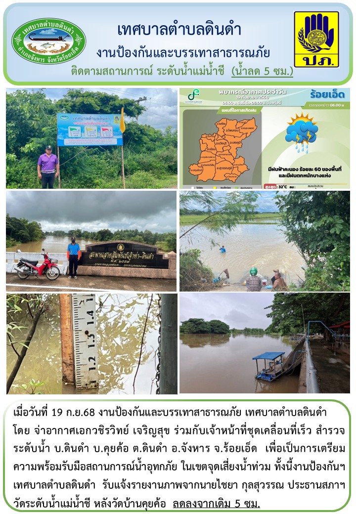 \r\nโดย จ่าอากาศเอกวชิรวิทย์ เจริญสุข ร่วมกับเจ้าหน้าที่ชุดเคลื่อนที่เร็ว สำรวจระดับน้ำ บ.ดินดำ บ.คุยค้อ ต.ดินดำ อ.จังหาร จ.ร้อยเอ็ด เพื่อเป็นการเตรียมความพร้อมรับมือสถานการณ์น้ำอุทกภัย ในเขตจุดเสี่ยงน้ำท่วม ทั้งนี้งานป้องกันฯเทศบาลตำบลดินดำ รับแจ้งรายงานภาพจากนายไชยา กุลสุวรรณ ประธานสภาฯ วัดระดับน้ำแม่น้ำชี หลังวัดบ้านคุยค้อ ลดลงจากเดิม 5 ซม.