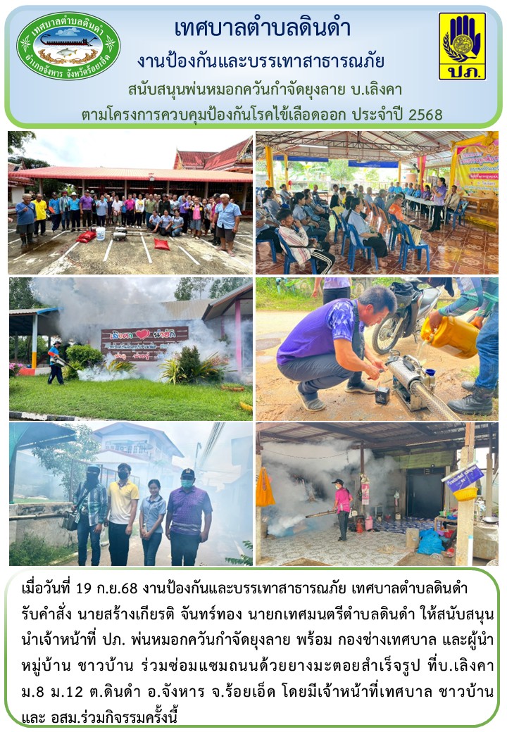 \r\nรับคำสั่ง นายสร้างเกียรติ จันทร์ทอง นายกเทศมนตรีตำบลดินดำ ให้สนับสนุนนำเจ้าหน้าที่ ปภ. พ่นหมอกควันกำจัดยุงลาย พร้อม กองช่างเทศบาล และผู้นำหมู่บ้าน ชาวบ้าน ร่วมซ่อมแซมถนนด้วยยางมะตอยสำเร็จรูป ที่บ.เลิงคา ม.8 ม.12 ต.ดินดำ อ.จังหาร จ.ร้อยเอ็ด โดยมีเจ้าหน้าที่เทศบาล ชาวบ้าน และ อสม.ร่วมกิจรรมครั้งนี้