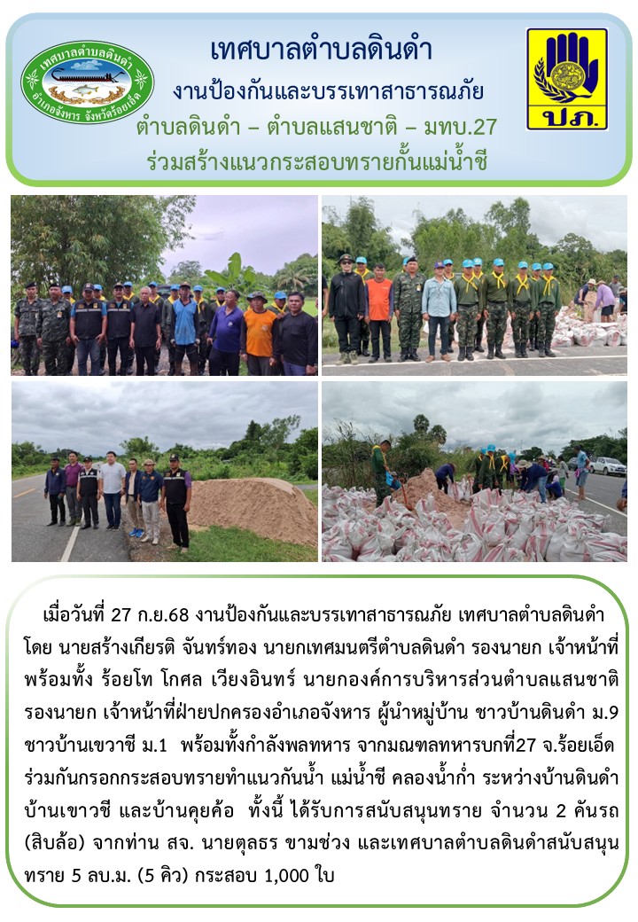 \r\nโดย นายสร้างเกียรติ จันทร์ทอง นายกเทศมนตรีตำบลดินดำ รองนายก เจ้าหน้าที่พร้อมทั้ง ร้อยโท โกศล เวียงอินทร์ นายกองค์การบริหารส่วนตำบลแสนชาติ รองนายก เจ้าหน้าที่ฝ่ายปกครองอำเภอจังหาร ผู้นำหมู่บ้าน ชาวบ้านดินดำ ม.9 ชาวบ้านเขวาชี ม.1 พร้อมทั้งกำลังพลทหาร จากมณฑลทหารบกที่27 จ.ร้อยเอ็ด ร่วมกันกรอกกระสอบทรายทำแนวกันน้ำ แม่น้ำชี คลองน้ำก่ำ ระหว่างบ้านดินดำ บ้านเขาวชี และบ้านคุยค้อ ทั้งนี้ ได้รับการสนับสนุนทราย จำนวน 2 คันรถ (สิบล้อ) จากท่าน สจ. นายตุลธร ขามช่วง และเทศบาลตำบลดินดำสนับสนุน ทราย 5 ลบ.ม. (5 คิว) กระสอบ 1,000 ใบ