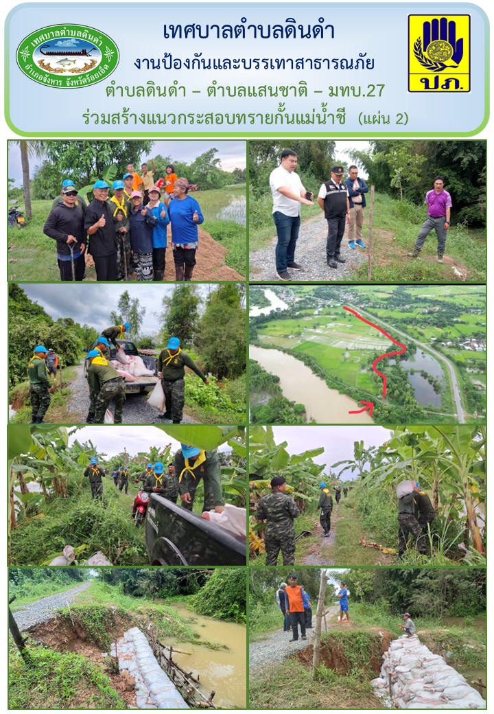\r\nโดย นายสร้างเกียรติ จันทร์ทอง นายกเทศมนตรีตำบลดินดำ รองนายก เจ้าหน้าที่พร้อมทั้ง ร้อยโท โกศล เวียงอินทร์ นายกองค์การบริหารส่วนตำบลแสนชาติ รองนายก เจ้าหน้าที่ฝ่ายปกครองอำเภอจังหาร ผู้นำหมู่บ้าน ชาวบ้านดินดำ ม.9 ชาวบ้านเขวาชี ม.1 พร้อมทั้งกำลังพลทหาร จากมณฑลทหารบกที่27 จ.ร้อยเอ็ด ร่วมกันกรอกกระสอบทรายทำแนวกันน้ำ แม่น้ำชี คลองน้ำก่ำ ระหว่างบ้านดินดำ บ้านเขาวชี และบ้านคุยค้อ ทั้งนี้ ได้รับการสนับสนุนทราย จำนวน 2 คันรถ (สิบล้อ) จากท่าน สจ. นายตุลธร ขามช่วง และเทศบาลตำบลดินดำสนับสนุน ทราย 5 ลบ.ม. (5 คิว) กระสอบ 1,000 ใบ
