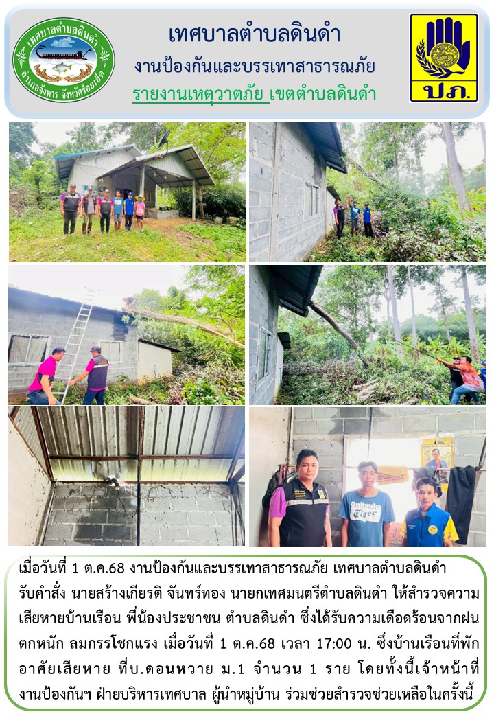\r\nรับคำสั่ง นายสร้างเกียรติ จันทร์ทอง นายกเทศมนตรีตำบลดินดำ ให้สำรวจความเสียหายบ้านเรือน พี่น้องประชาชน ตำบลดินดำ ซึ่งได้รับความเดือดร้อนจากฝนตกหนัก ลมกรรโชกแรง เมื่อวันที่ 1 ต.ค.68 เวลา 17:00 น. ซึ่งบ้านเรือนที่พักอาศัยเสียหาย ที่บ.ดอนหวาย ม.1 จำนวน 1 ราย โดยทั้งนี้เจ้าหน้าที่งานป้องกันฯ ฝ่ายบริหารเทศบาล ผู้นำหมู่บ้าน ร่วมช่วยสำรวจช่วยเหลือในครั้งนี้
