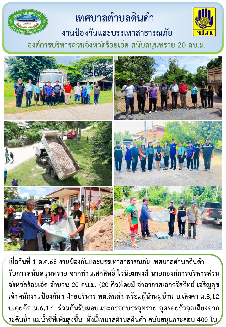 \r\nรับการสนับสนุนทราย จากท่านเสกสิทธิ์ ไวนิยมพงศ์ นายกองค์การบริหารส่วนจังหวัดร้อยเอ็ด จำนวน 20 ลบ.ม. (20 คิว)โดยมี จ่าอากาศเอกวชิรวิทย์ เจริญสุข เจ้าพนักงานป้องกันฯ ฝ่ายบริหาร ทต.ดินดำ พร้อมผู้นำหมู่บ้าน บ.เลิงคา ม.8,12 บ.คุยค้อ ม.6,17 ร่วมกันรับมอบและกรอกบรรจุทราย อุดรอยรั่วจุดเสี่ยงจากระดับน้ำ แม่น้ำชีที่เพิ่มสูงขึ้น ทั้งนี้เทบาลตำบลดินดำ สนับสนุนกระสอบ 400 ใบ