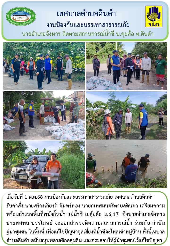 \r\nรับคำสั่ง นายสร้างเกียรติ จันทร์ทอง นายกเทศมนตรีตำบลดินดำ เตรียมความพร้อมสำรวจพื้นที่พนังกั้นน้ำ แม่น้ำชี บ.คุ้ยค้อ ม.6,17 ซึ่งนายอำเภอจังหาร นายทศพล บวรโมทย์ จะออกสำรวจติดตามสถานการณ์น้ำ ร่วมกับ กำนัน ผู้นำชุมชน ในพื้นที่ เพื่อแก้ไขปัญหาจุดเสี่ยงที่น้ำชีจะไหลเข้าหมู่บ้าน ทั้งนี้เทบาลตำบลดินดำ สนับสนุนพลาสติกคลุมดิน และกระสอบให้ผู้นำชุมชนไว้แก้ไขปัญหา