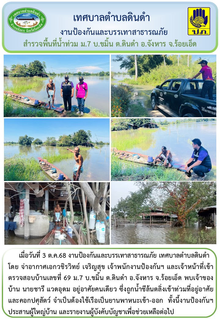 \r\nโดย จ่าอากาศเอกวชิรวิทย์ เจริญสุข เจ้าพนักงานป้องกันฯ และเจ้าหน้าที่เข้าตรวจสอบบ้านเลขที่ 69 ม.7 บ.ขมิ้น ต.ดินดำ อ.จังหาร จ.ร้อยเอ็ด พบเจ้าของบ้าน นายชารี แวดอุดม อยู่อาศัยคนเดียว ซึ่งถูกน้ำชีล้นตลิ่งเข้าท่วมที่อยู่อาศัย และคอกปศุสัตว์ จำเป็นต้องใช้เรือเป็นยานพาหนะเข้า-ออก ทั้งนี้งานป้องกันฯ ประสานผู้ใหญ่บ้าน และรายงานผู้บังคับบัญชาเพื่อช่วยเหลือต่อไป